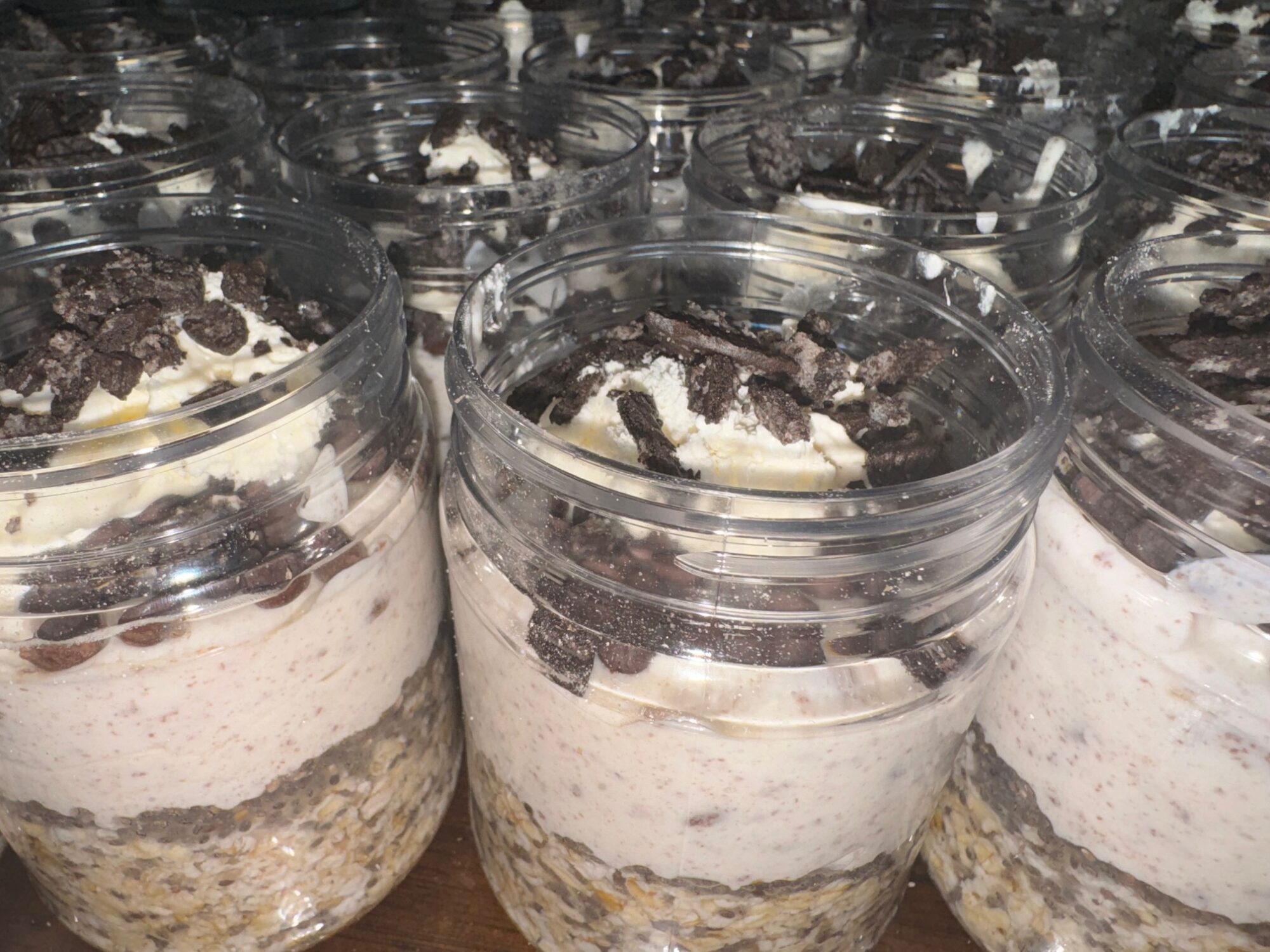 Rolled Oats, Chia Seeds, Greek Yogurt, Whey Protein, Stevia, Crushed Oreos, Cool Whip, Mini Chocolate Chips