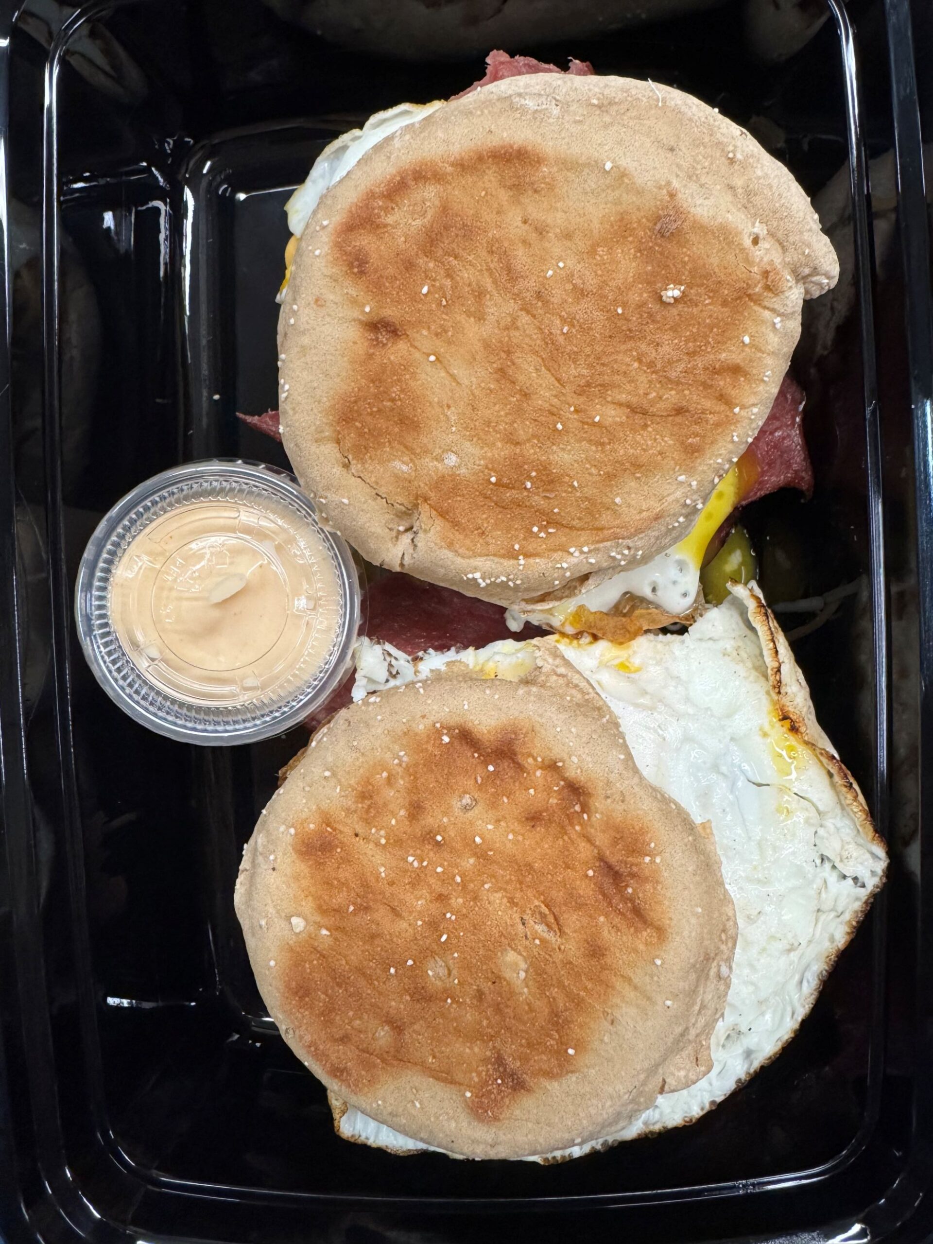 (2) Toasted English Muffin w/ Sunny Side Up Egg, Turkey Bacon, Cheddar Cheese, & Tabasco Mayo