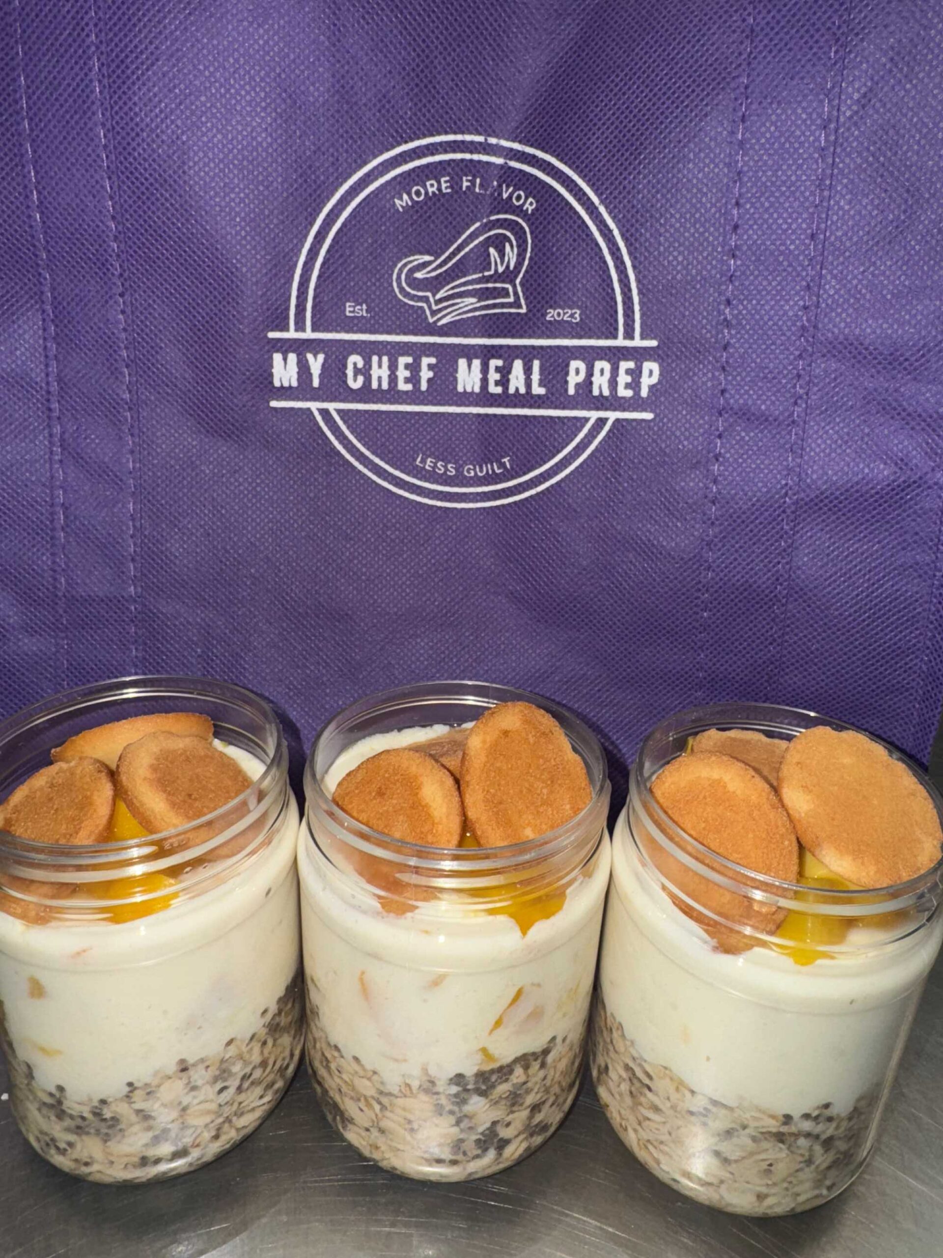 Rolled Oats, Chia Seeds, Greek Yogurt, Stevia, Whey Protein, Mango, Low-fat Cream Cheese, Mini Nilla Wafers,