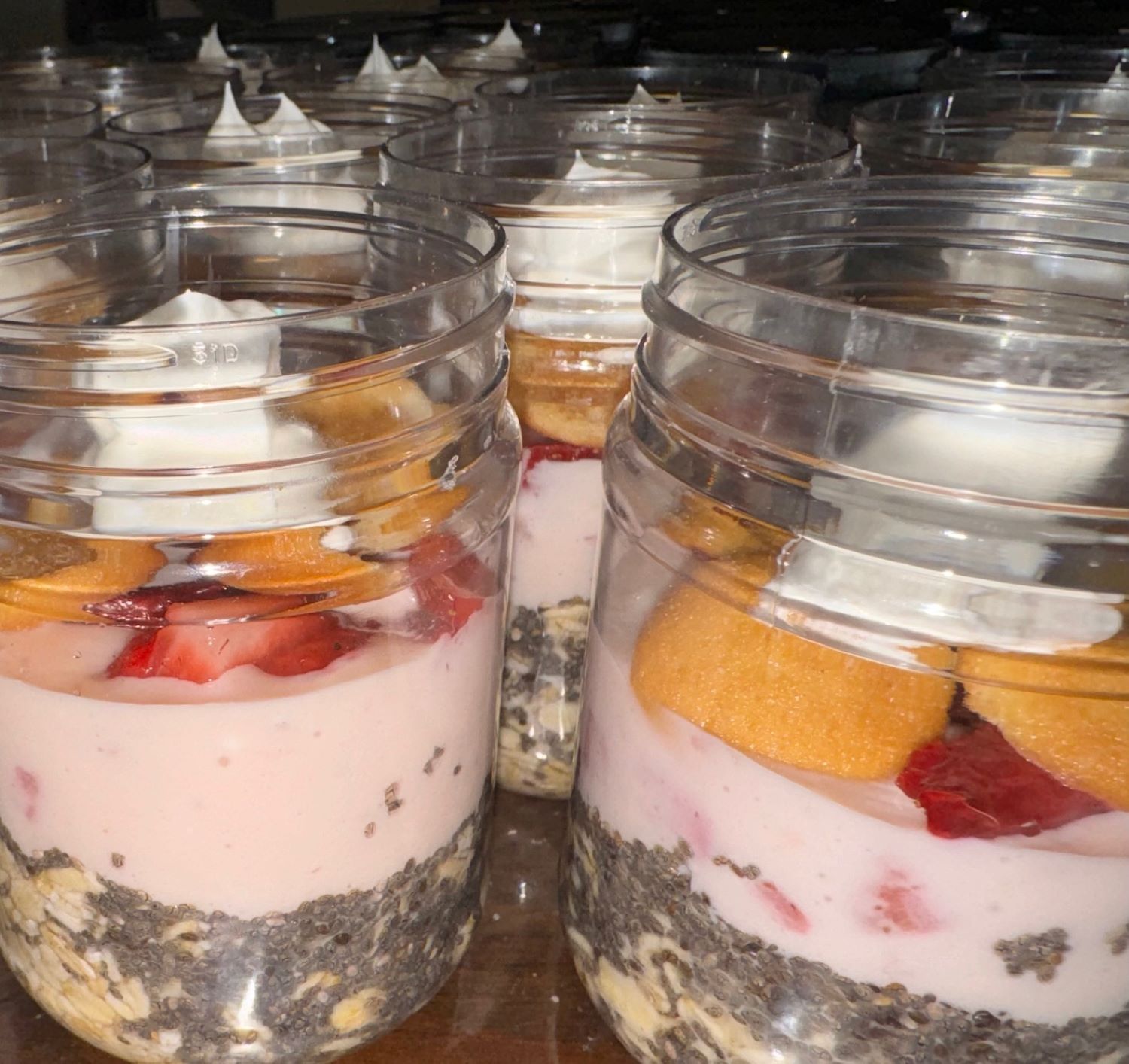 Rolled Oats, Chia Seeds, Greek Yogurt, Stevia, Whey Protein, Fresh Strawberries, Mini Nilla Wafers, Sugar Free Cool Whip