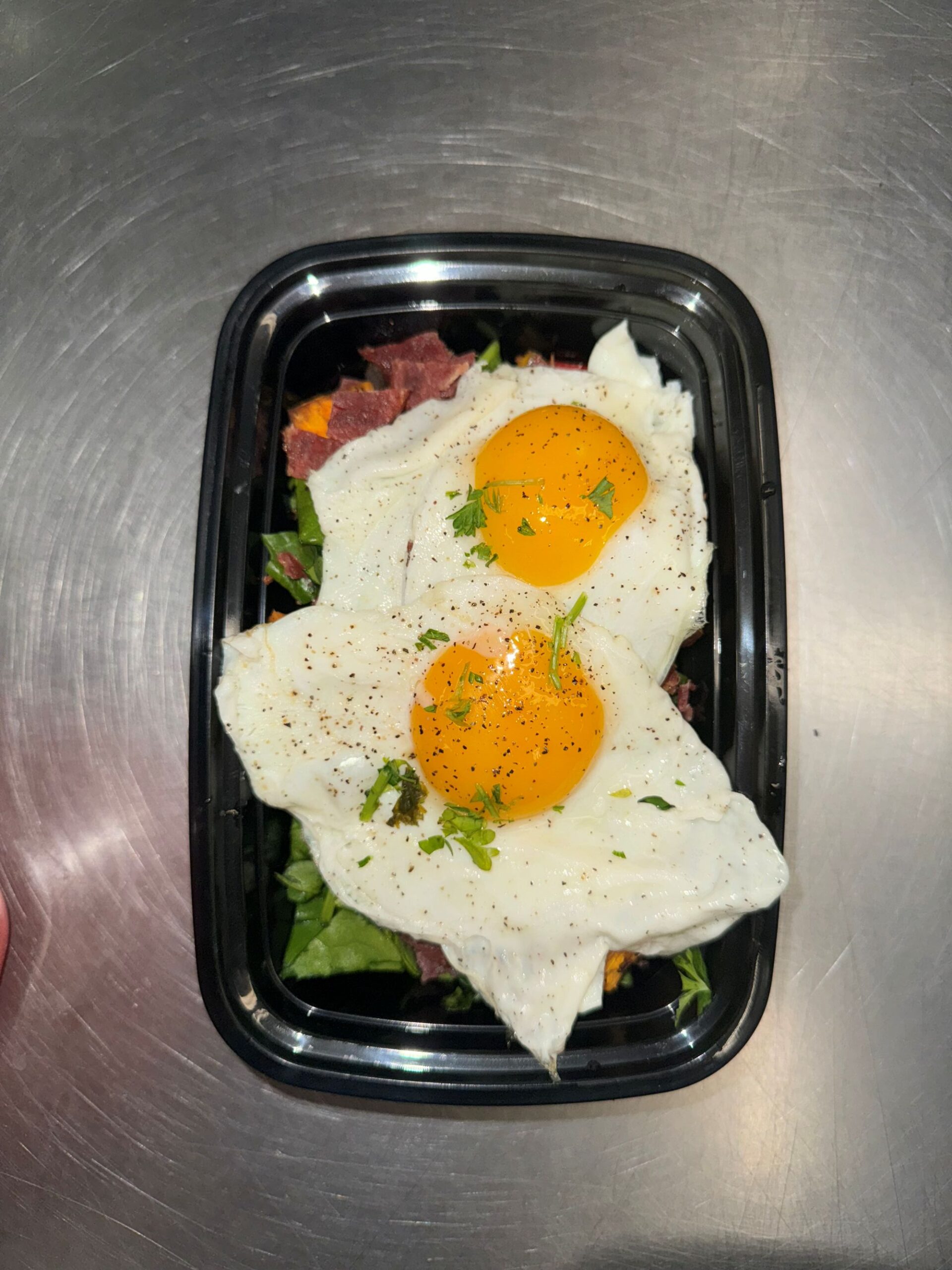 Sweet Potato Hash w/ Spinach, Ham, Onions, Peppers, & Sunny Side Up Eggs